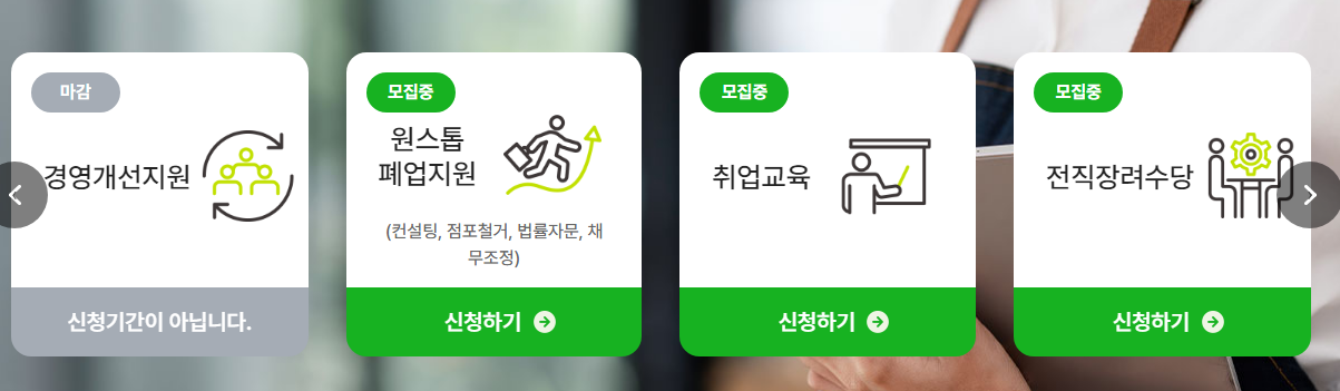 - 내용: 폐업 신고 등 행정처리, 점포 철거, 법률 및 채무 조정 등을 패키지로 지원합니다.